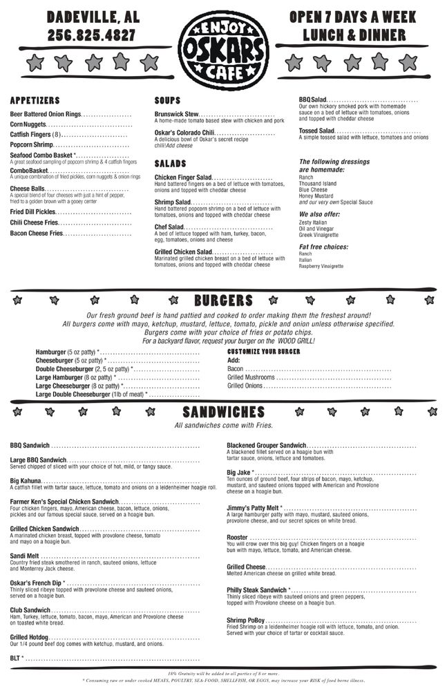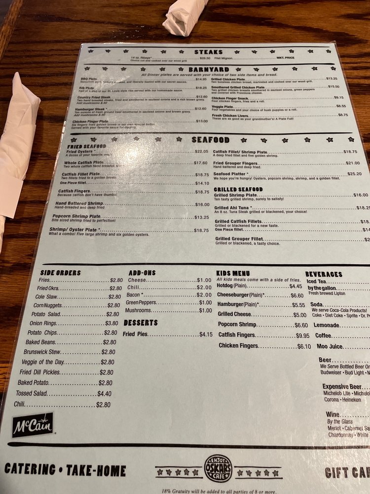 Welcome to Oskar's Cafe, a charming eatery located in Dadeville, AL, known for its delicious sandwiches, burgers, and seafood dishes. This women-owned establishment offers a range of amenities, including takeout, delivery, and catering services. Customers praise the homemade sauces, tasty fried pickles, and mouthwatering catfish po boy. The rustic lakeside decor adds to the welcoming atmosphere, making it a perfect spot for a family outing or a casual meal with friends. Their extensive menu features many vegetarian options, beer and wine selections, and happy hour specials. Don't miss out on their famous 7-layer chocolate cake or the Royal Reds appetizer, as recommended by loyal patrons. Whether you're a local or just passing through, Oskar's Cafe promises a delightful dining experience worth returning for.